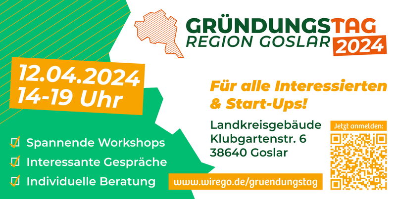 Am Freitag, den 12.04.2024, in der Zeit von 14.00 Uhr bis 19.00 Uhr können sich im Hauptgebäude des Landkreises Goslar (Klubgartenstraße 6, 38640 Goslar) Gründungsinteressierte, Studierende, Schüler*innen und junge Unternehmer*innen in Impulsvorträgen und Expertengesprächen rund um die Themen Selbstständigkeit, Wachstum, Nachfolge sowie über einschlägige Fachthemen informieren. Auch der Austausch mit Gleichgesinnten soll an diesem Tag nicht zu kurz kommen.