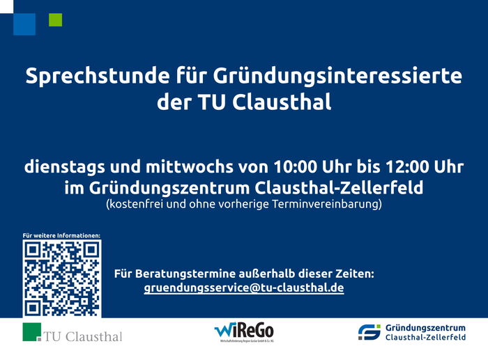 Zusätzlich bieten das gemeinsame Gründungsteam dienstags und mittwochs von 10:00 bis 12:00 Uhr eine offene Gründungssprechstunde im Gründungszentrum Clausthal-Zellerfeld (Campusgelände, Agricolastraße 8) an. Hierfür braucht es keine Anmeldungen oder vorherige Terminvereinbarungen.