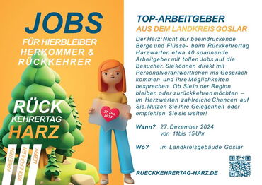 Wenn sich am 27.12.2024 zwischen 11:00 und 15:00 Uhr die Türen des Landkreisgebäudes in Goslar öffnen, dann ist es wieder soweit: Bereits zum dritten Mal präsentieren sich attraktive Arbeitgeber der Region auf dem „Rückkehrertag Region Goslar“ den Besuchern. Neben zahlreichen Unternehmen finden sich auch Kommunen unten den Ausstellenden.