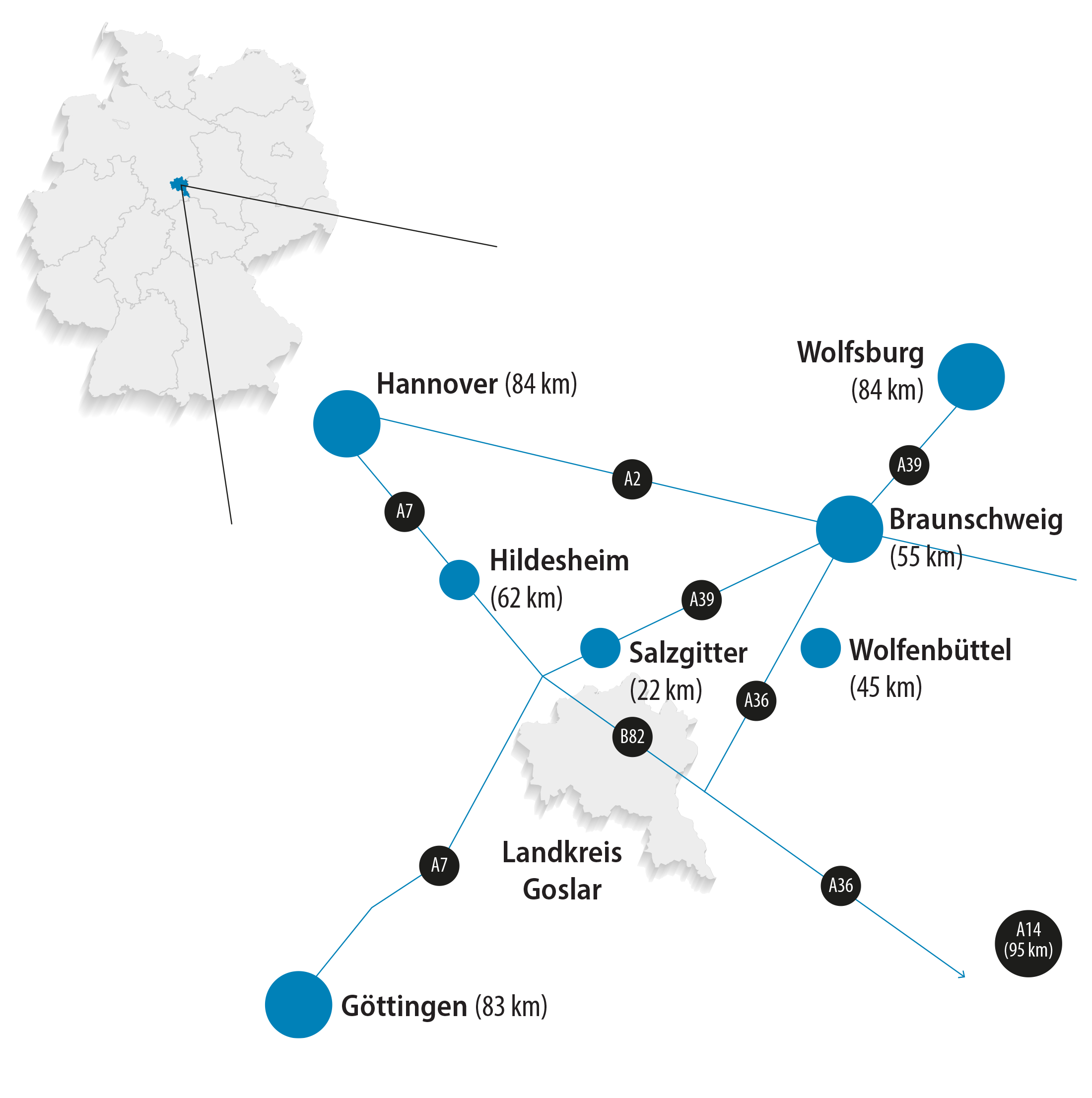 Durch seine zentrale Lage ist der Landkreis gut an die Hauptverkehrsadern angebunden, liegt er doch direkt zwischen der A7 (im Westen) und der A36 (im Osten). Auch die vielleicht wichtigste Ost-West-Trasse in Deutschland, die A2, ist nicht weit entfernt. Gut 90 Kilometer nordwestlich liegt die niedersächsische Landeshauptstadt Hannover mit ihrem internationalen Verkehrsflughafen. Göttingen befindet sich in ähnlicher Entfernung südlich des Landkreises. Die vom Volkswagen-Konzern geprägte Automotive-Region mit den Städten Braunschweig, Wolfsburg und Salzgitter befindet sich ca. 45 Autominuten in nördlicher Richtung. Alle genannten Städte sind über die Autobahnen innerhalb einer Stunde erreichbar.