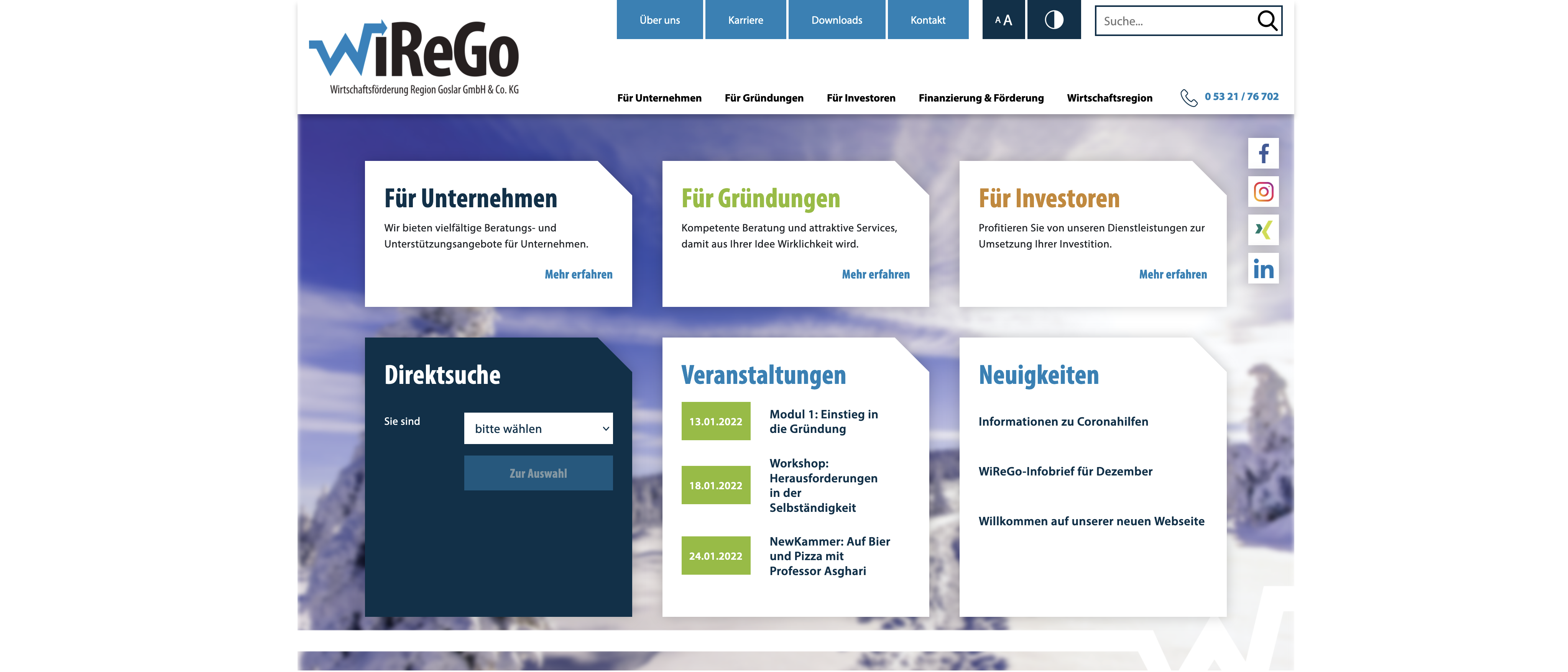 Die WiReGo hat sich digital neu aufgestellt. Mit einer neuen Homepage und Präsenzen bei XING, LinkedIn, Facebook und Instagram ist die Wirtschaftsregion Goslar nun zeitgemäß in allen Medien aktiv.
